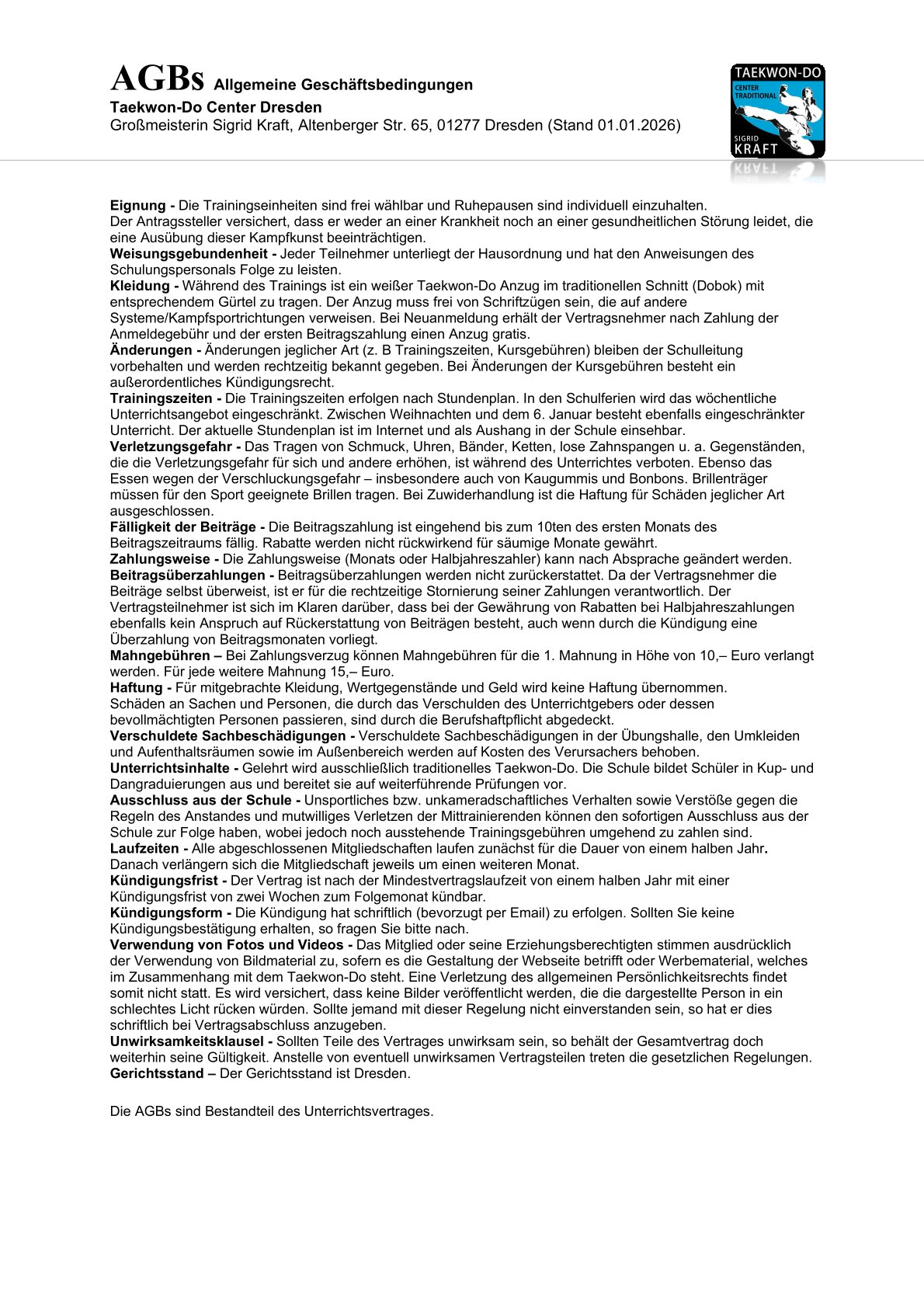 Allgemeine Geschäftsbedingungen Taekwon-Do Center Dresden (Stand 01.01.2026).